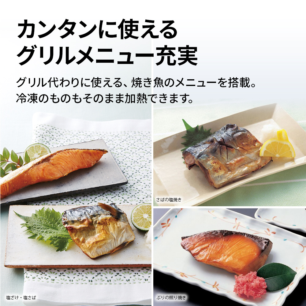 ヘルシオ利用者で使用頻度の高い「まかせて調理 焼く」と「ヘルシオあたため」の 揚げたてサックリ、焼きたてふっくら、焼きたてパンふんわりに対応。過熱水蒸気を使って毎日の食事作りをサポートします。ヘルシオが得意な焼きそばやゆで卵メニューももちろん搭載!また塩ざけ・塩さばやさばの塩焼き、チキンステーキなどグリル自動メニューも充実。