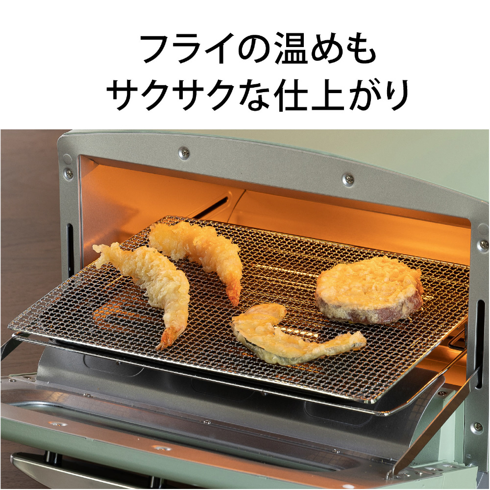 付属の受け皿を使えば、天ぷら、唐揚げ、魚のフライなど、冷めてしまった揚げ物も余分な油を落としながらサクッと温め直せます。