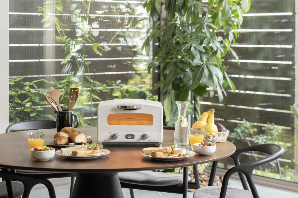 「グラファイトヒータ」がわずか0.2秒で発熱し、庫内の温度を高くします。高温で一気に焼き上げることで、外はカリッと、中は水分が残っているのでモチモチのトーストに仕上がります。さらに内部までしっかり熱が伝わることで小麦本来の甘味が引き出され、より一層おいしさを感じられるのも特長です。スピーディーかつ高温で調理することが、アラジンならではの“極上のトースト”を実現する秘訣です。