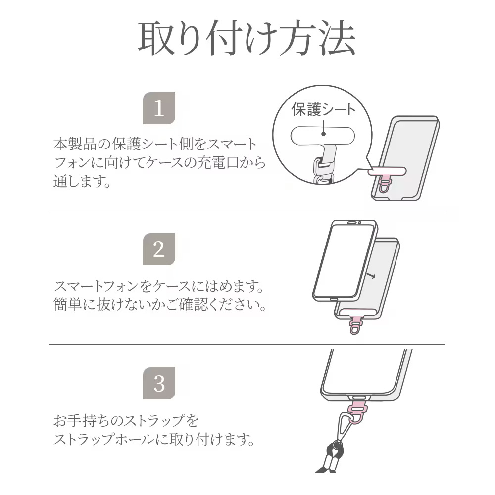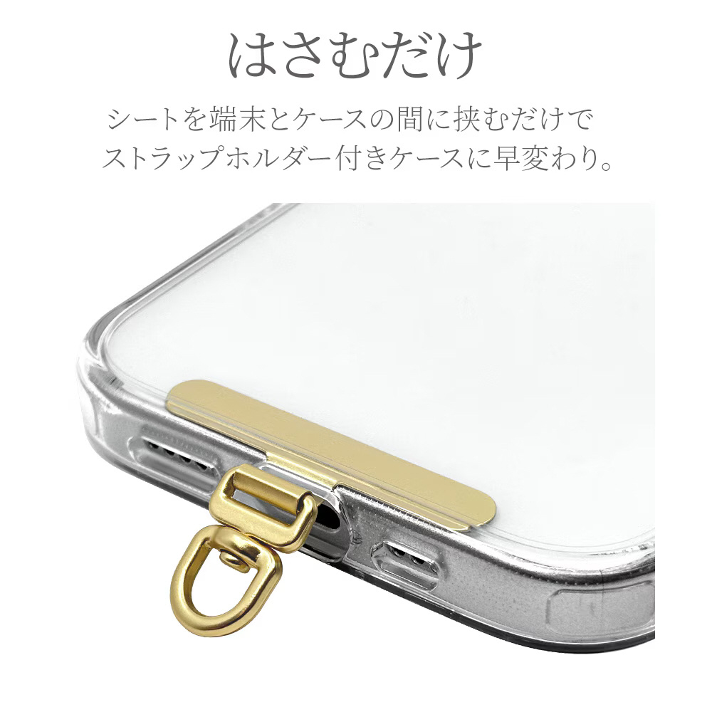 本製品はスマートフォン用ストラップシートです。ストラップホールがないスマートフォンにも簡単にストラップを取り付けられます。