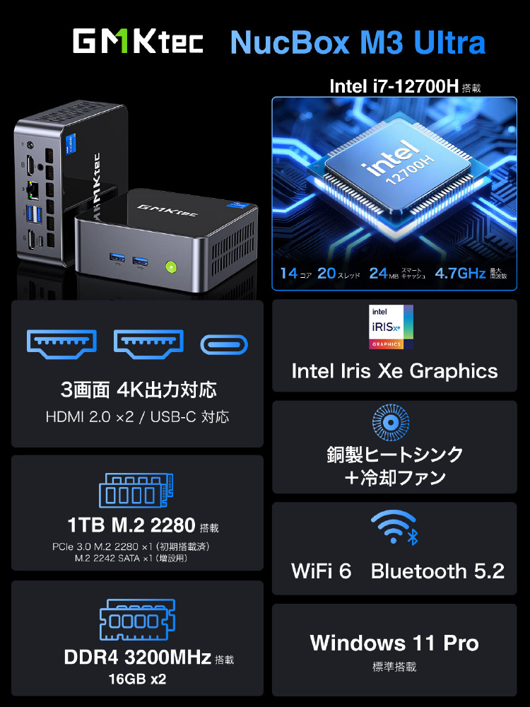 GMKtec NucBox M3 Ultraは、Intel Core i7-12700Hを搭載した高性能ミニPCです。14コア20スレッド、最大4.7 GHz動作の高性能CPUと32 GBの大容量メインメモリ、1 TBのM.2 PCIe 3.0 高速SSDを搭載することで画像や動画編集なども快適に行えます。HDMIとUSB-C端子を組み合わせて最大3画面同時出力に対応し、在宅ワークのようなビジネスからプライベートまで、省スペースで生産性を最大限に高めることができます。