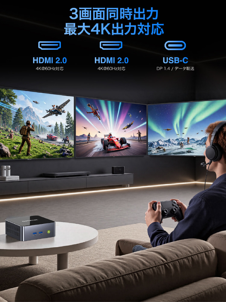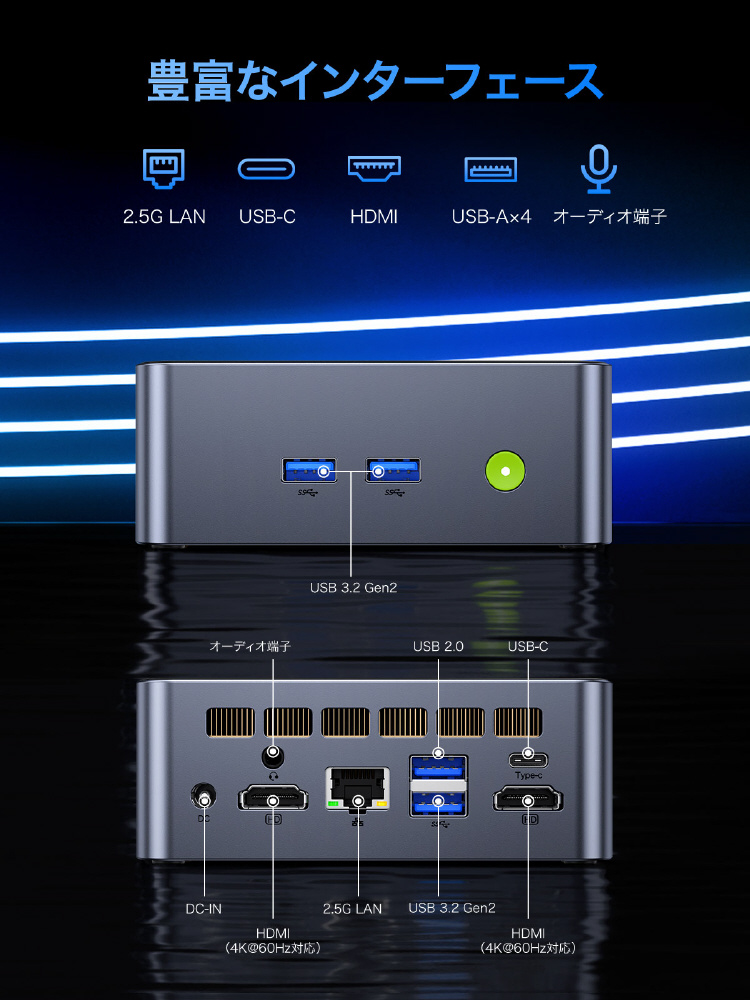 2つのHDMI 2.0とUSB-C端子により、最大で3画面同時出力に対応します。アクセスしやすい本体正面のUSB 3.2 Gen2端子を始め、2.5G LANポートを搭載し高い拡張性を確保しています。