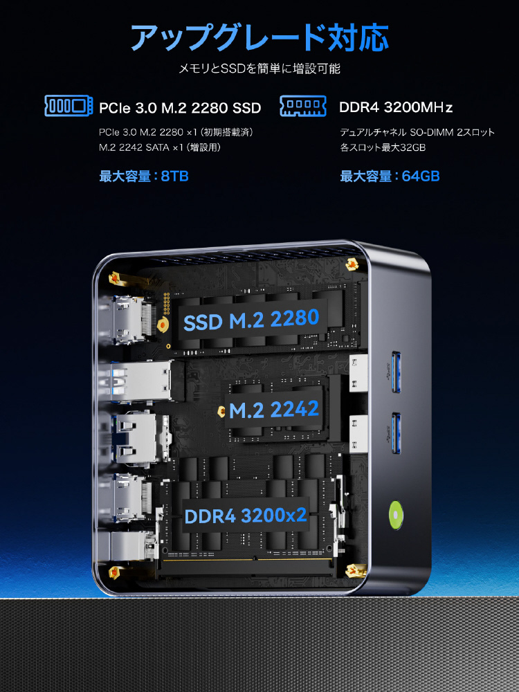 最新の高速規格に対応した大容量の32GBメモリと1TB M.2 SSDを搭載するだけでなく、それぞれ増設・交換によって更にアップグレードすることが可能です。