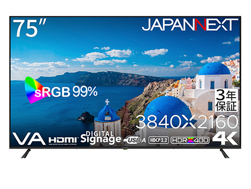 「【3年保証モデル】75インチ VAパネル搭載 4K(3840x2160)解像度 大型液晶モニター HDMI ビデオ/音声入力 コンポーネント入力 オプティカル音声出力 sRGB:99% HDR400相当 USBメモリ再生対応 リモコン同梱」
