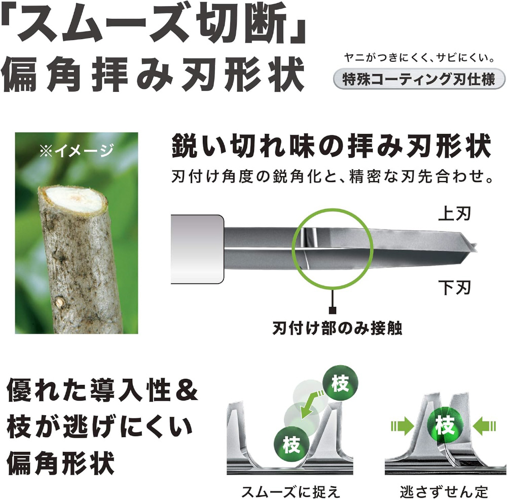 ●スムーズ切断、偏角拝み刃形状:鋭い切れ味の拝み形状。刃付け角度の鋭角化と、精密な刃先合わせ。優れた導入性&枝が逃げにくい。スムーズに捉え→逃がさず剪定