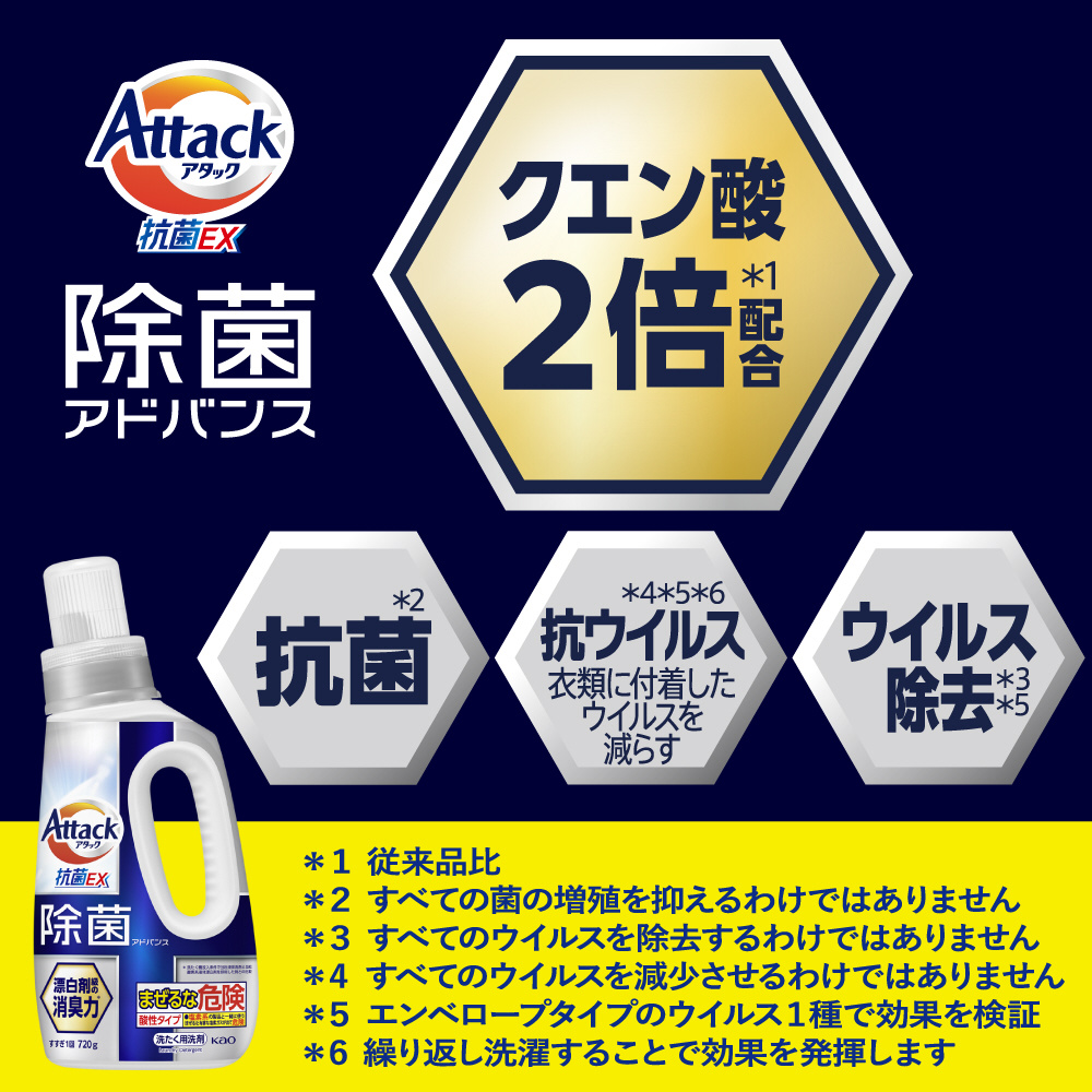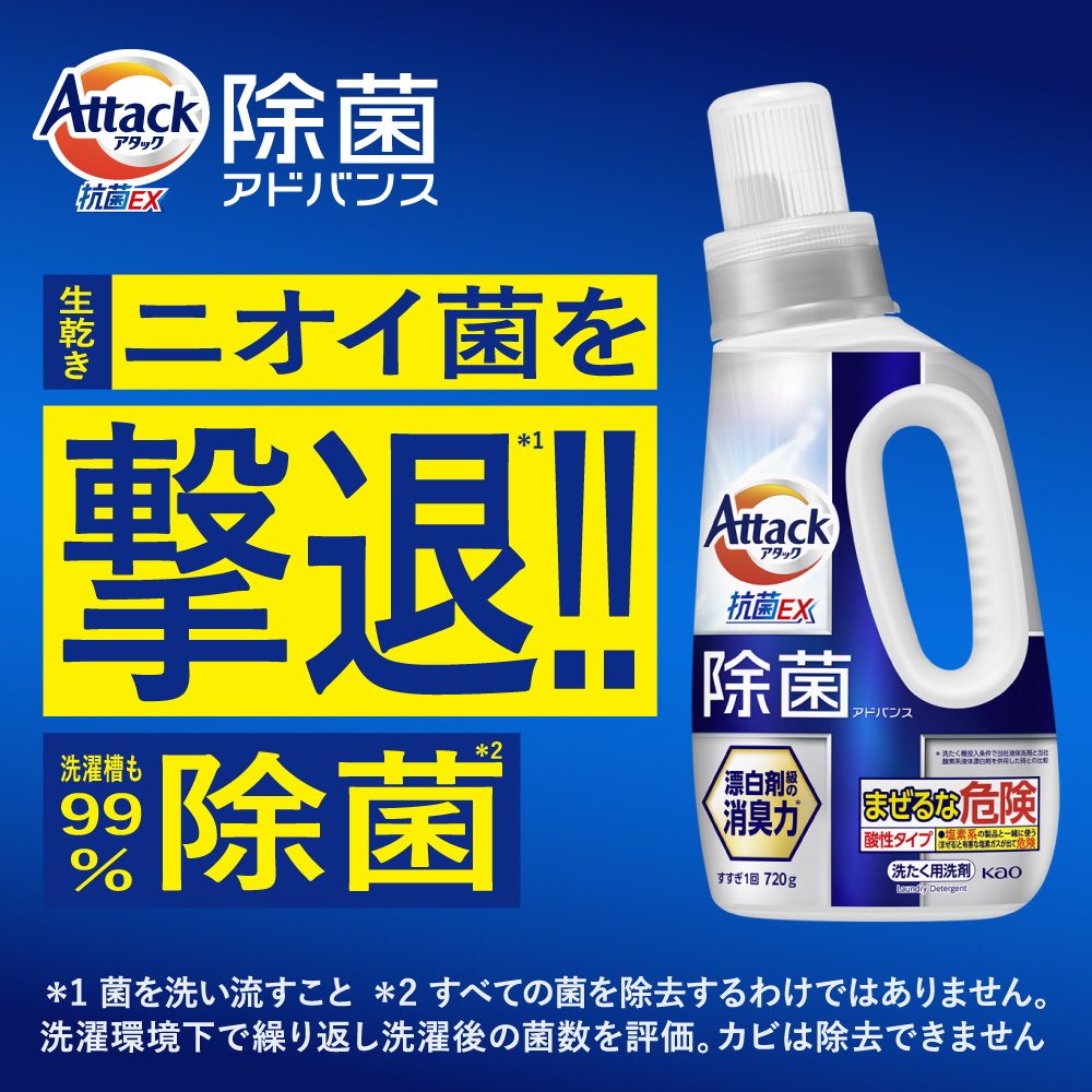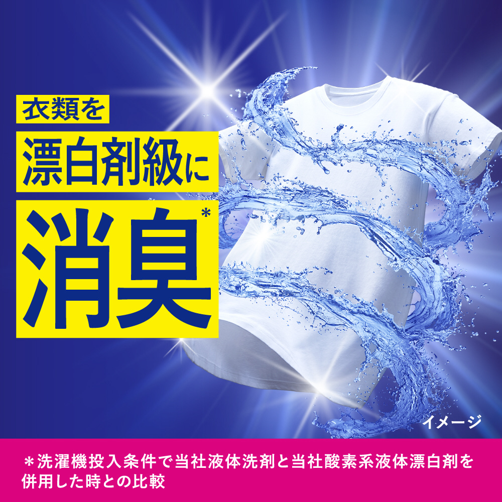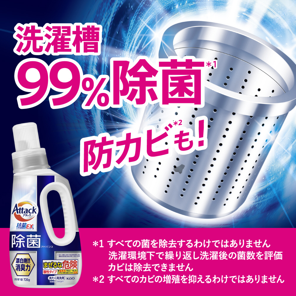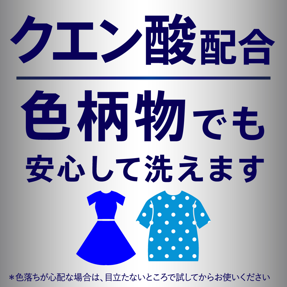 生乾きニオイ菌を撃退*1洗たく槽も99%除菌*2*3。クエン酸2倍*4配合。■抗菌*5■ウイルス除去*2*6*1菌を洗い流すこと*2すべての菌・ウイルスを除去するわけではありません*3洗たく環境下で繰り返し洗浄後の菌数を評価 カビは除去できません*4従来品比*5すべての菌の増殖を抑えるわけではありません*6エンベロープタイプのウイルス1種で効果を検証