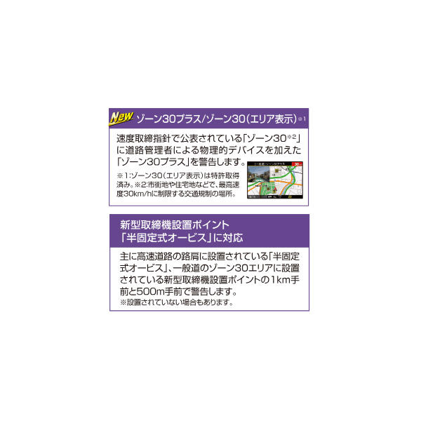 ゾーン30エリア表示、地図に沿って警告や案内を表示が可能です。※地図データは年1回有償にて更新が可能です。