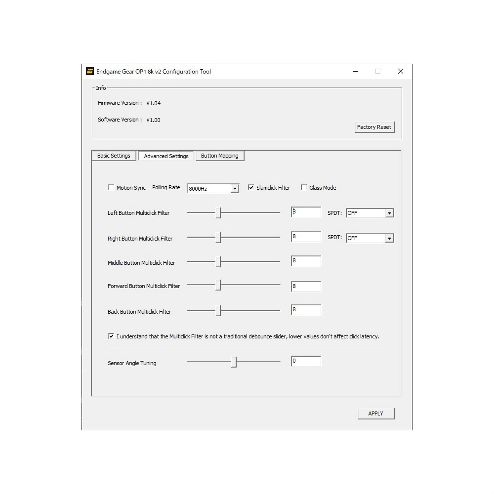 各ボタン設定、メインボタンのモード切替、マルチクリックフィルター、ポーリングレートやLOD設定等が行えるソフトウェアを用意。