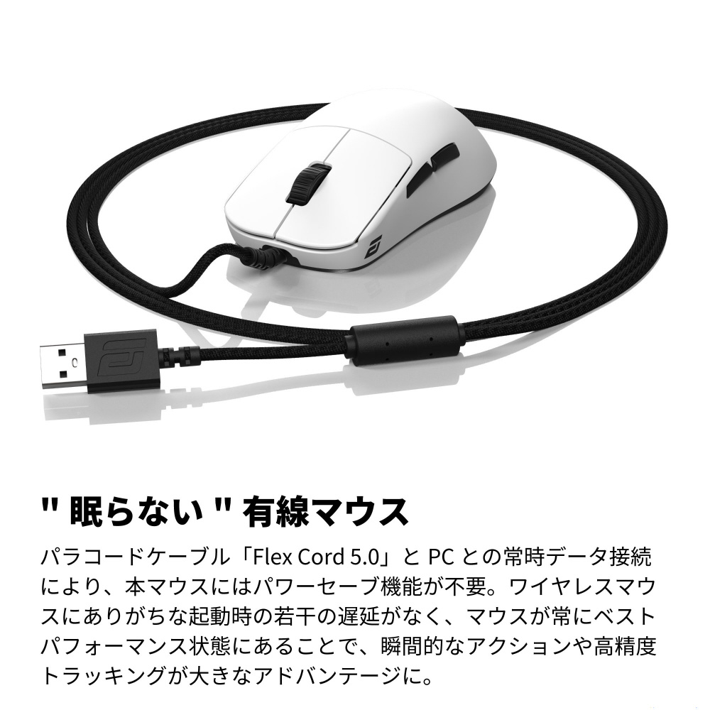 パラコードケーブル「Flex Cord 5.0」とPCとの常時データ接続により、本マウスにはパワーセーブ機能が不要。
