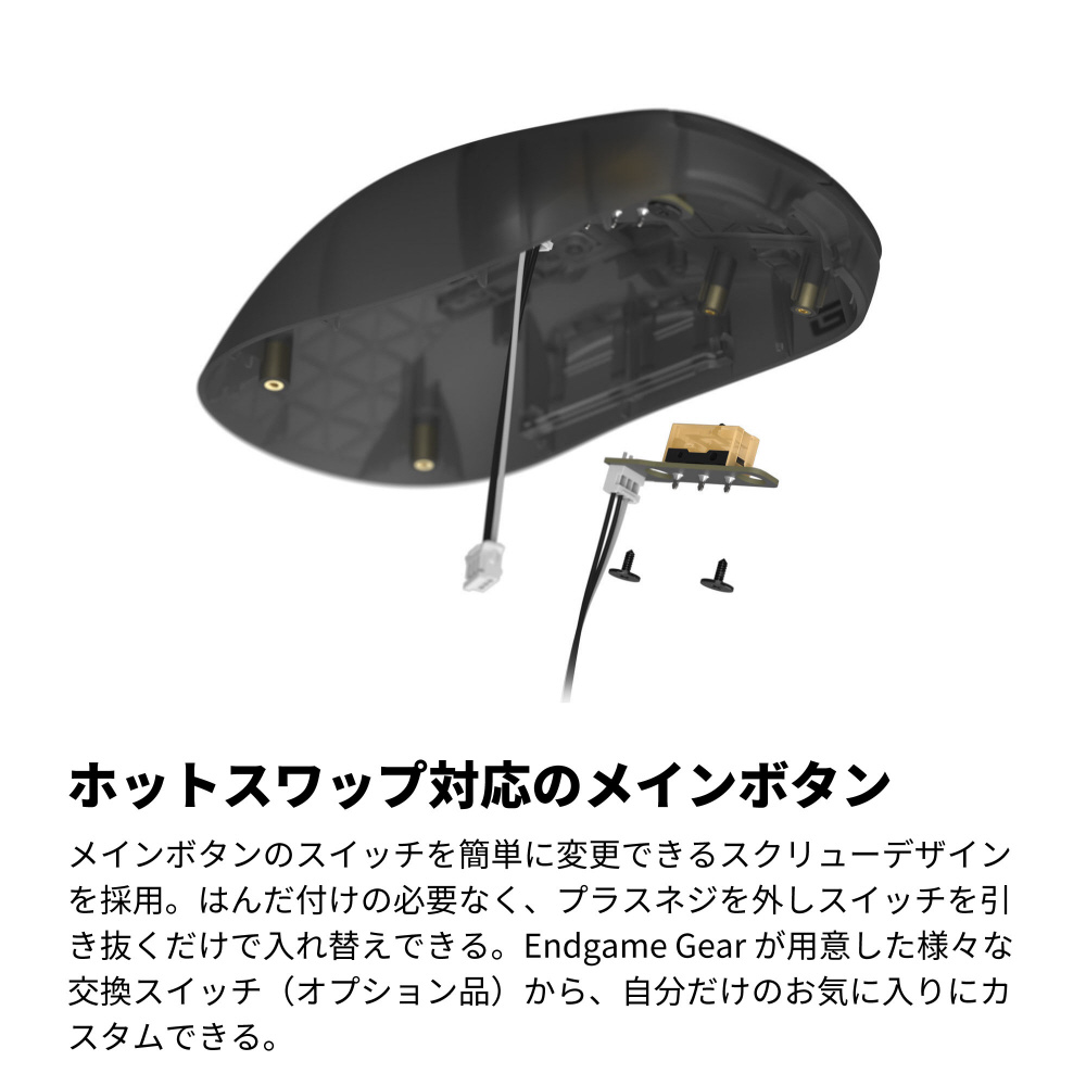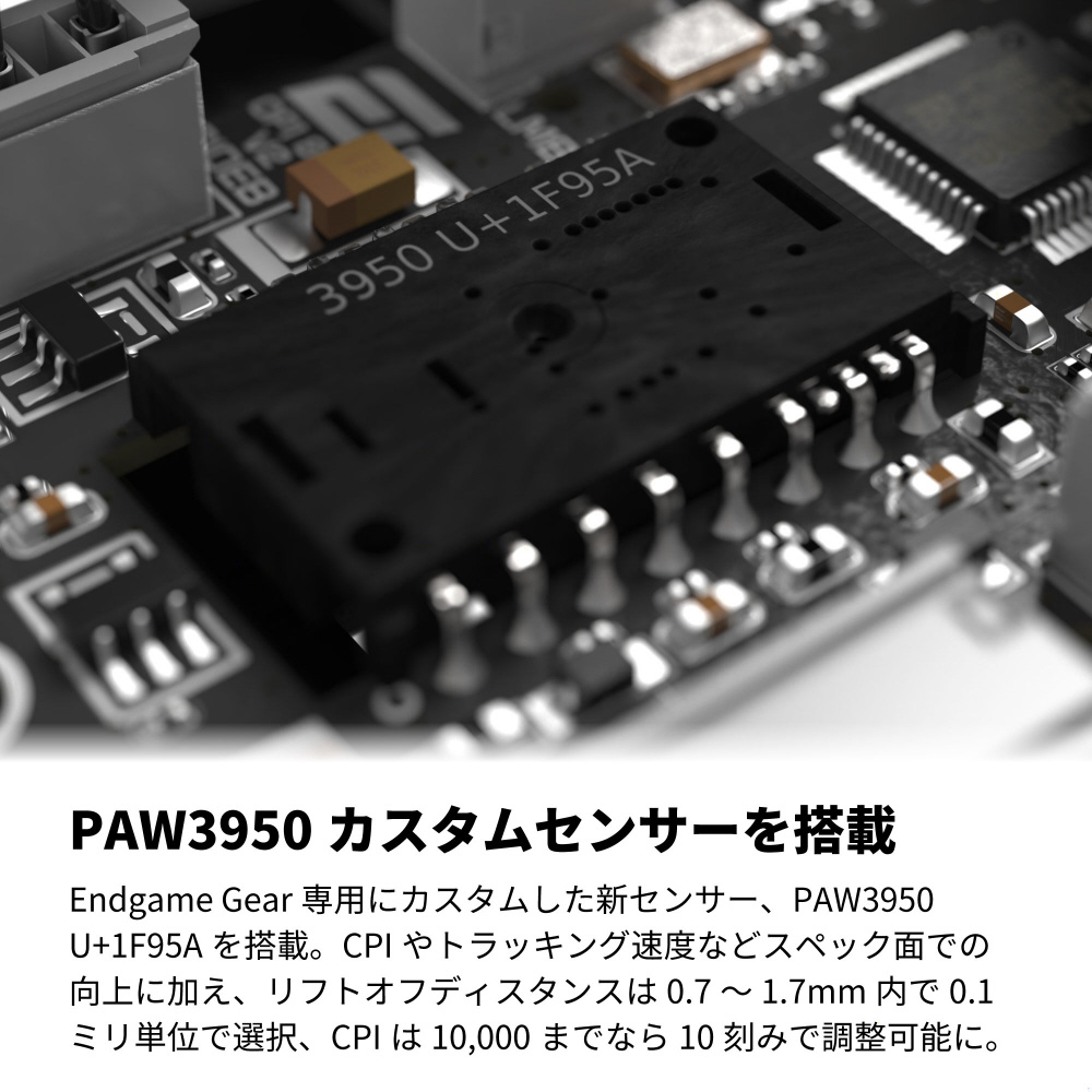 Endgame Gear専用にカスタムした新センサー、PAW3950 U+1F95Aを搭載。CPIやトラッキング速度などスペック面での向上に加え、リフトオフディスタンスは0.7〜1.7mm内で0.1ミリ単位で選択、CPIは10000までなら10刻みで調整可能に。
