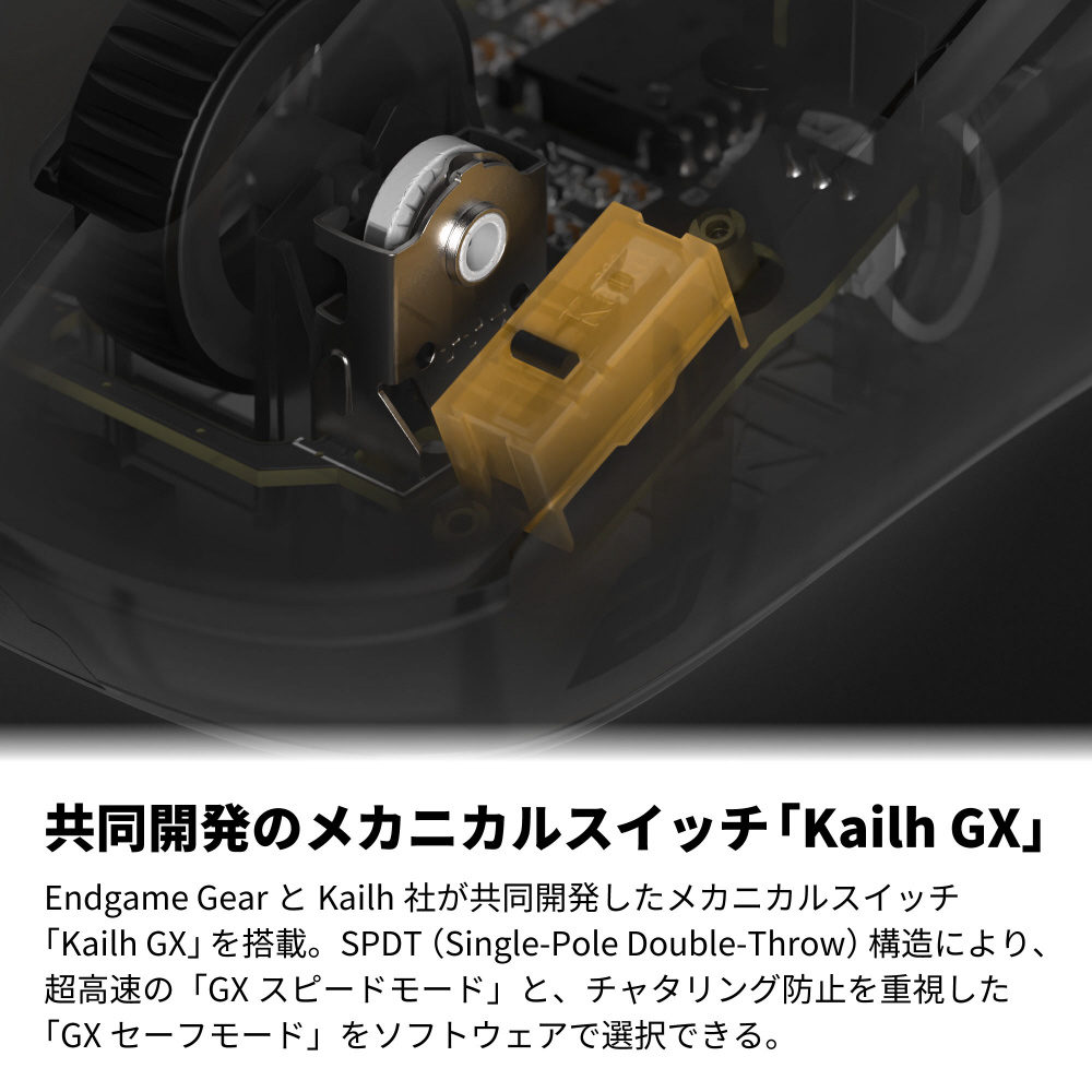 Endgame GearとKailh社が共同開発したメカニカルスイッチ「Kailh GX」を搭載。SPDT(Single-Pole Double-Throw)構造により、