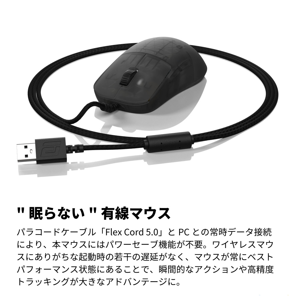 パラコードケーブル「Flex Cord 5.0」とPCとの常時データ接続により、本マウスにはパワーセーブ機能が不要。