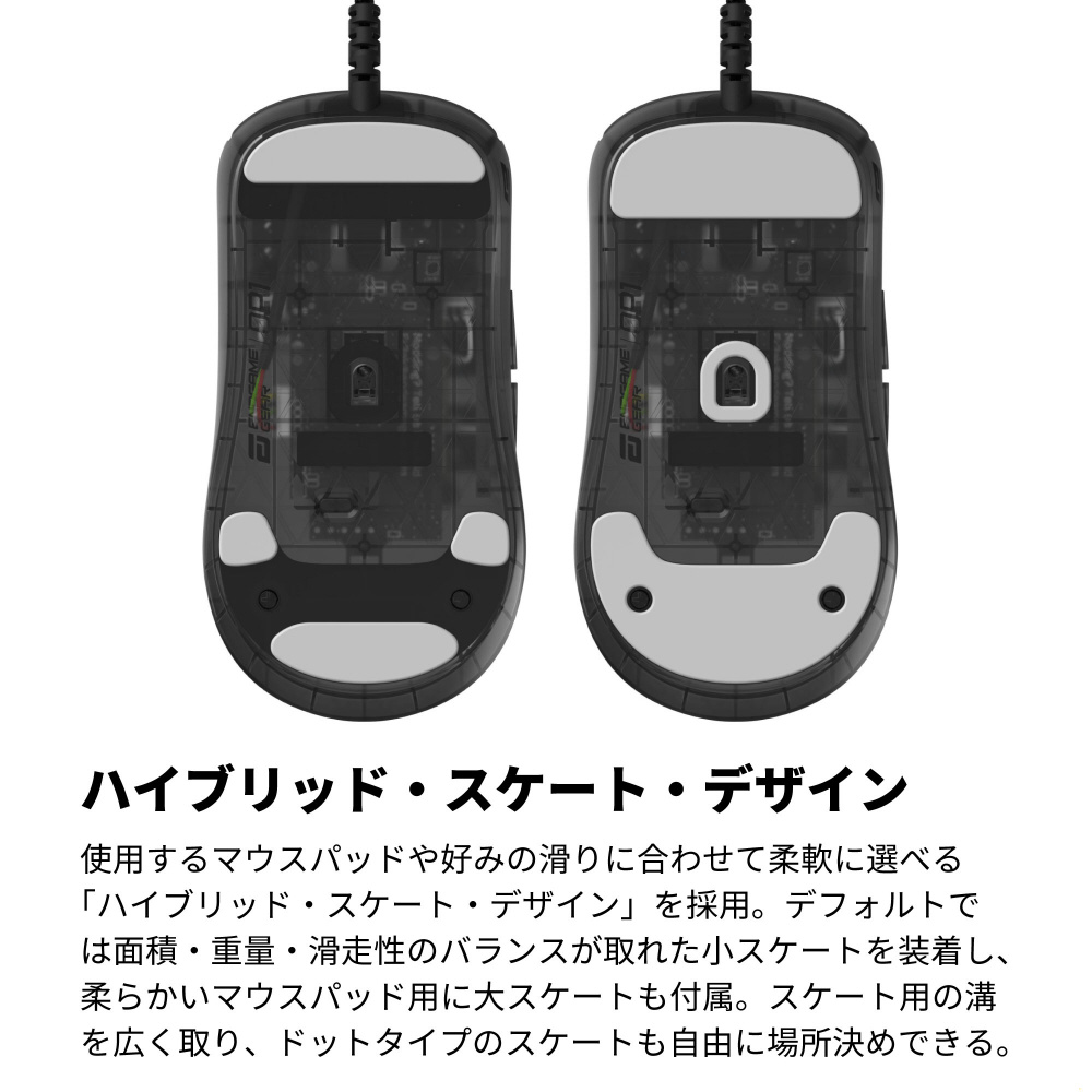 使用するマウスパッドや好みの滑りに合わせて柔軟に選べる「ハイブリッド・スケート・デザイン」を採用。