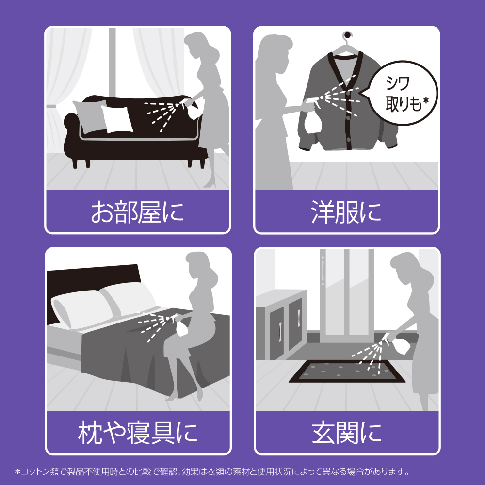 *1コットン類で製品不使用時との比較で検証。効果は衣類の素材と使用状況によって異なる場合があります。使用方法: 1か所につき2回スプレー後、生地を引っ張って伸ばす。 消臭スプレー