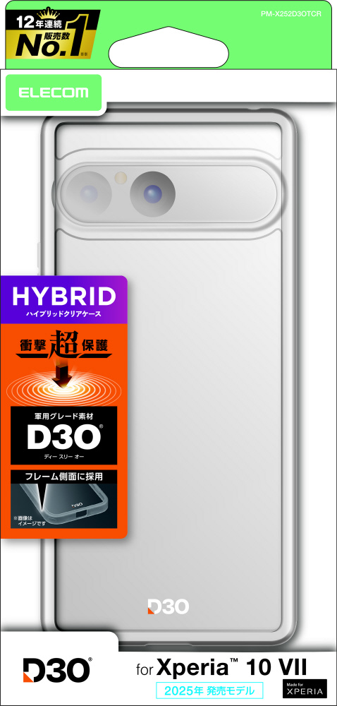 側面にミリタリーやモータースポーツで採用されている次世代の衝撃保護テクノロジーD3Oを使用した、ハーフクリアタイプの超耐衝撃性ハイブリッドケースです。背面は高硬度5Hの軽くて丈夫なポリカーボネート素材を採用しています。※当社基準による鉛筆硬度試験での実力値です。落下時に最も大きな衝撃が予想される四つ角にエアークッションを設置し、効率的に衝撃を吸収します。カメラへの傷を防ぐ、カメラレンズ保護設計です。