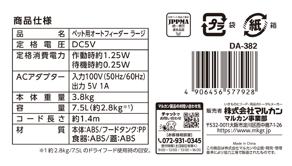 ※適合サイズであっても異形もしくは特殊形状のドライフードはフード詰まりの場合があります。様子を見ながらご使用してください。