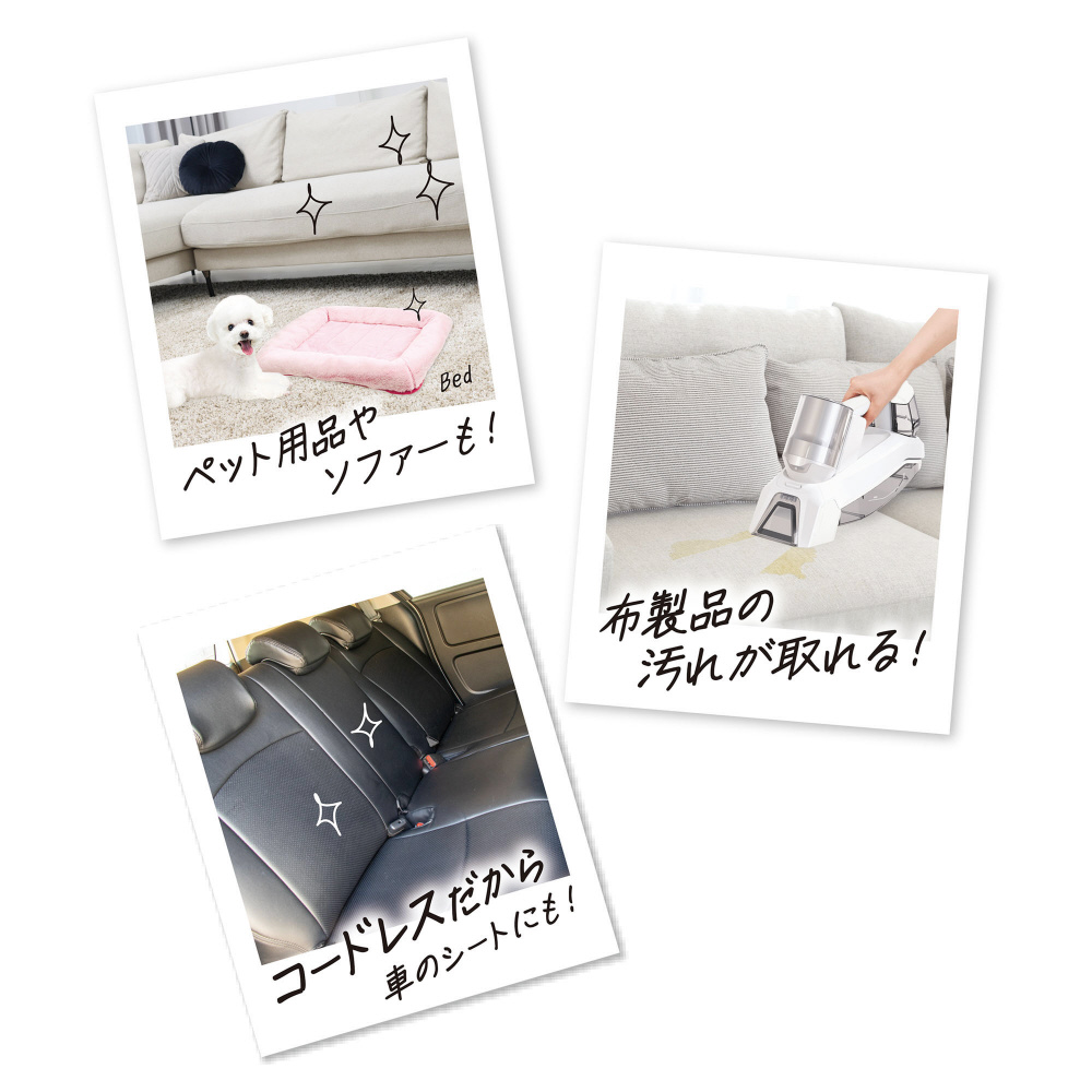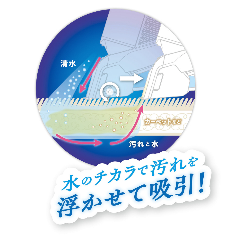 水の力で汚れを浮かせて吸引するウォッシャーハンディークリーナーです。