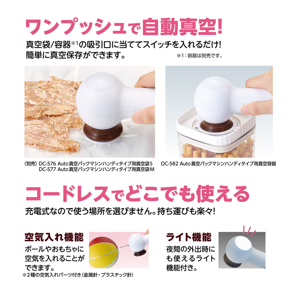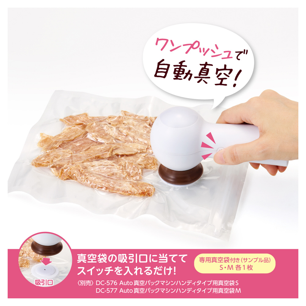 ・ワンプッシュで自動真空!吸引口に当ててスイッチを入れるだけで簡単に真空保存ができる真空パックマシンです。