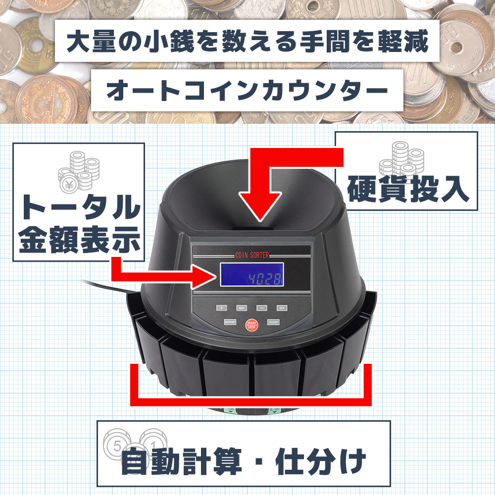 新硬貨対応、硬貨を投入するだけで自動で選別、計算を行う電動コインカウンター