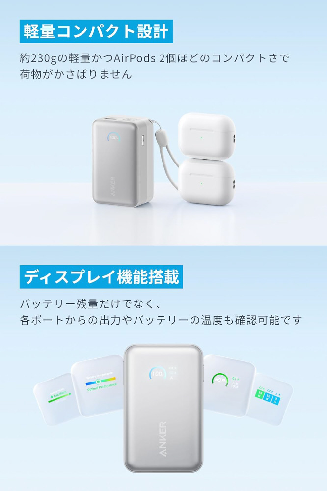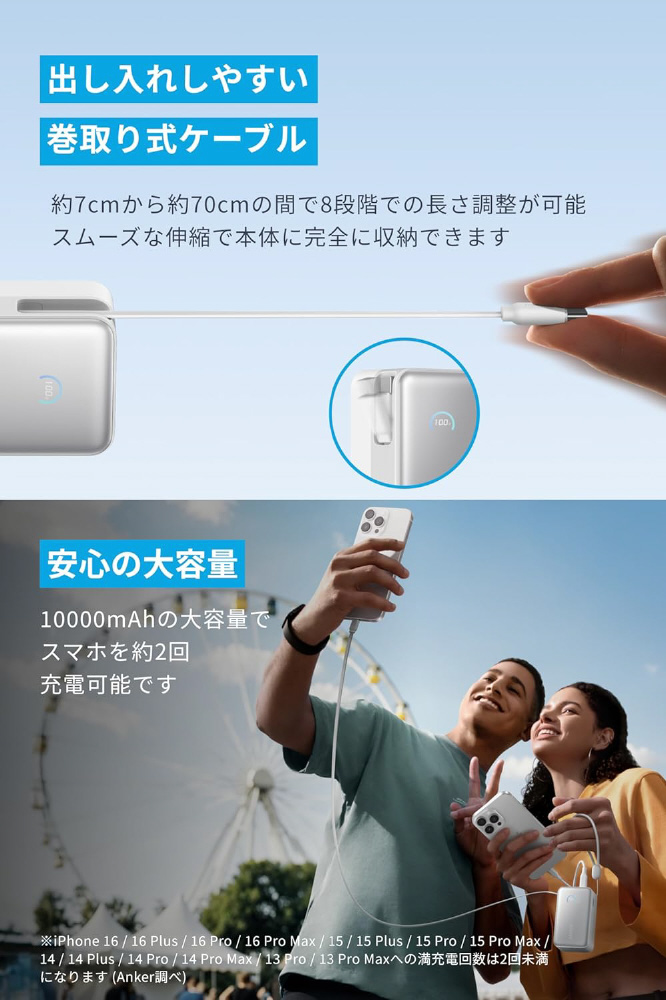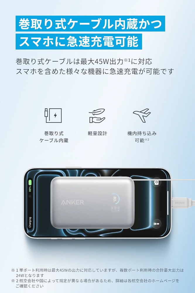 付属品 Anker Nano Power Bank (10000mAh 45W 巻取り式 USB-Cケーブル) 、ストラップ、取扱説明書、18ヶ月保証 + 6ヶ月 (Ankerで会員登録後) 、カスタマーサポート