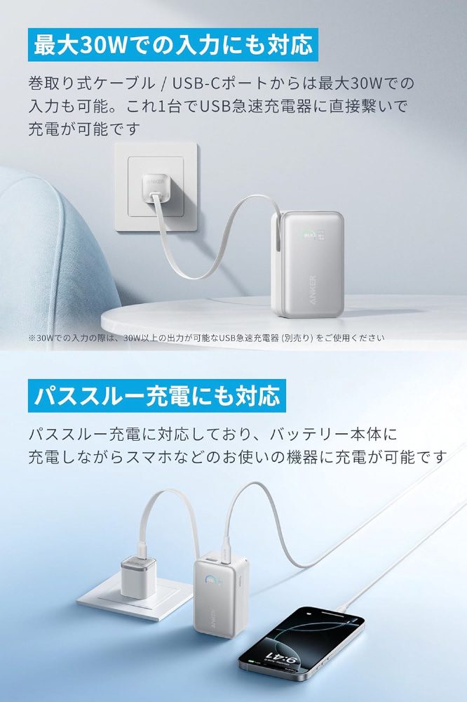 巻取り式ケーブル / USB-Cポートからは最大30Wでの入力も可能です。これ1台でUSB急速充電器に直接繋いで充電が可能です。
