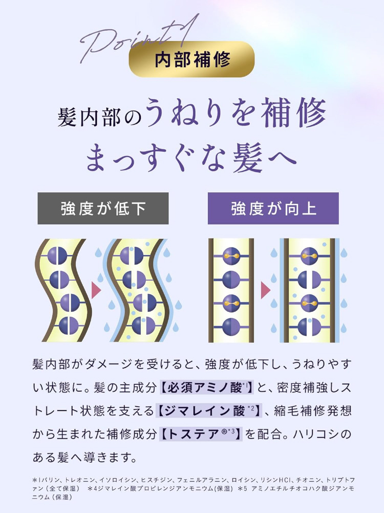 髪内部の強度に着目した美容液シャンプーと、ダメージを髪の深部から補修するトリートメント。