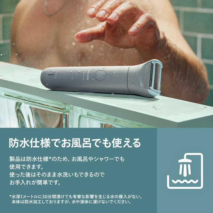 製品は防水仕様*2のため、お風呂やシャワーでも使用できます。使った後はそのまま水洗いもできるのでお手入れが簡単です。