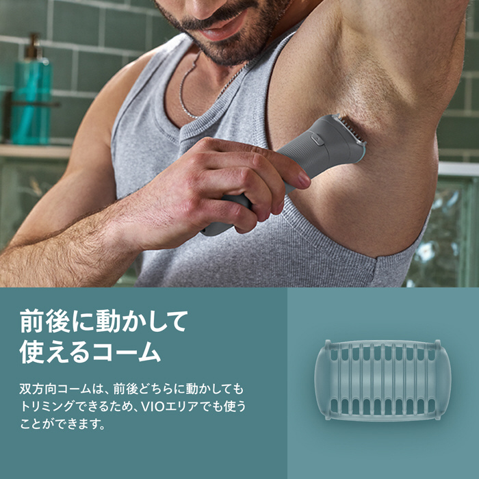 2 mmもしくは3 mm*3の長さにトリミングできる双方向コームは、前後どちらに動かしてもトリミングできるため、VIOエリアでも使うことができます。コームはシェービングユニットの上から被せるように取り付けられるので、取り付けも簡単です。