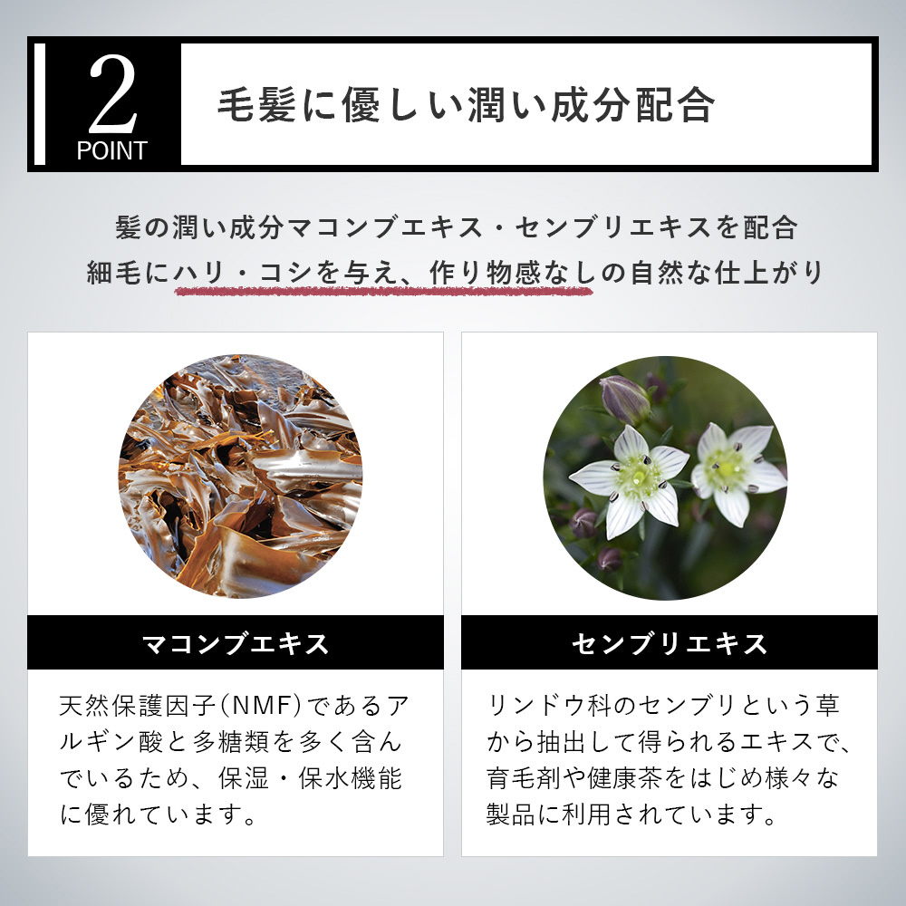 髪の潤い成分マコンブエキス、センブリエキスを配合し、ミクロパウダーが、細毛にハリやコシを与え、頭髪全体をボリュームアップ。スタイリングしながら、簡単に自然な髪を演出します。