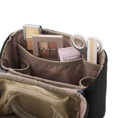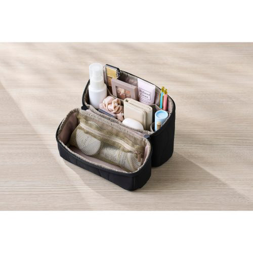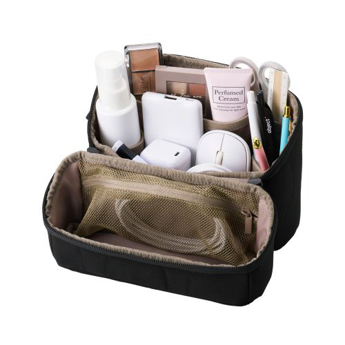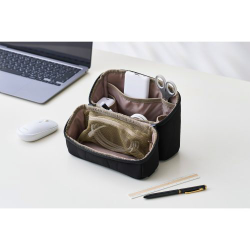 デスク周りの小物やガジェット、筆記用具などのワークツールをまとめてスッキリ収納!たっぷり入る大容量タイプで、デスク上で道具入れとして使える、スタンドタイプのツールポーチです。持ち運びに便利なハンドル付き。上品な光沢のあるオニオンステッチのキルティング素材を採用した、大人カジュアルなデザインです。