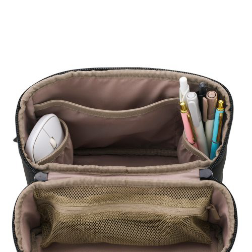ペンやケーブルをまとめて収納できるファスナー開閉式のメッシュポケットを備えています。