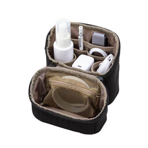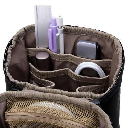 ペンやケーブルをまとめて収納できるファスナー開閉式のメッシュポケットを備えています。