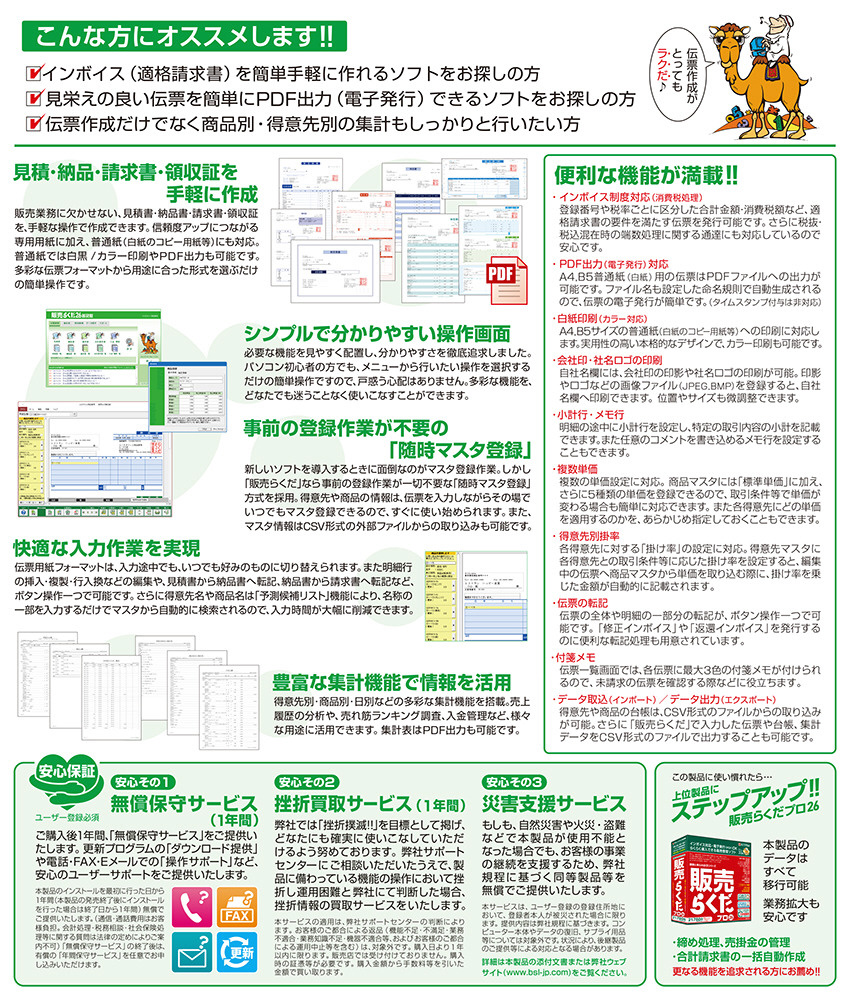 インボイス制度に対応した納品書・請求書・領収書などの伝票も、素早く簡単に印刷できます。販売らくだの廉価版。