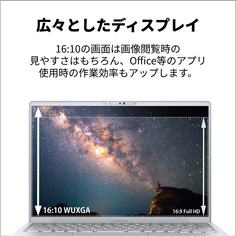 従来の縦横比16:9の画面よりも広い範囲を表示できる16:10の画面は、画像閲覧時の見やすさはもちろん、Office使用時の作業効率もアップします。