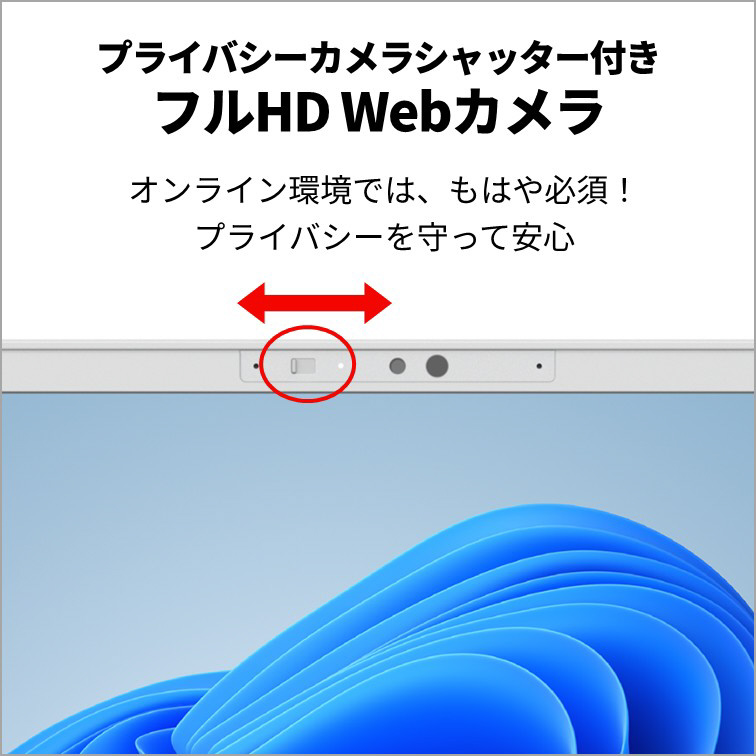顔認証対応のフルHD Webカメラには物理的にカメラを隠せる、プライバシーカメラシャッターが付いているので、顔を出したくないときにも安心です。