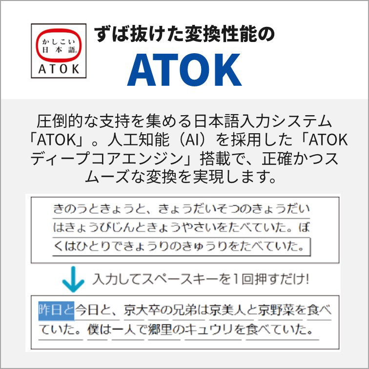 AI活用に便利な「Copilot キー」を搭載。約18.4mmと広めのキーピッチ、指の力に合わせてキーの重さを調整した多段階押下圧などにより、快適な文字入力を実現。テンキーやカーソルキーの配置にもこだわりました。