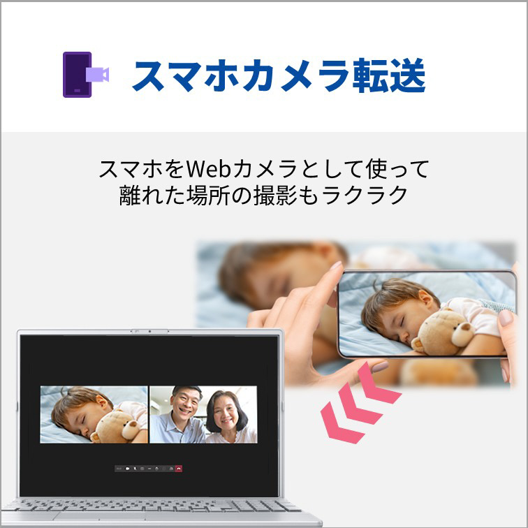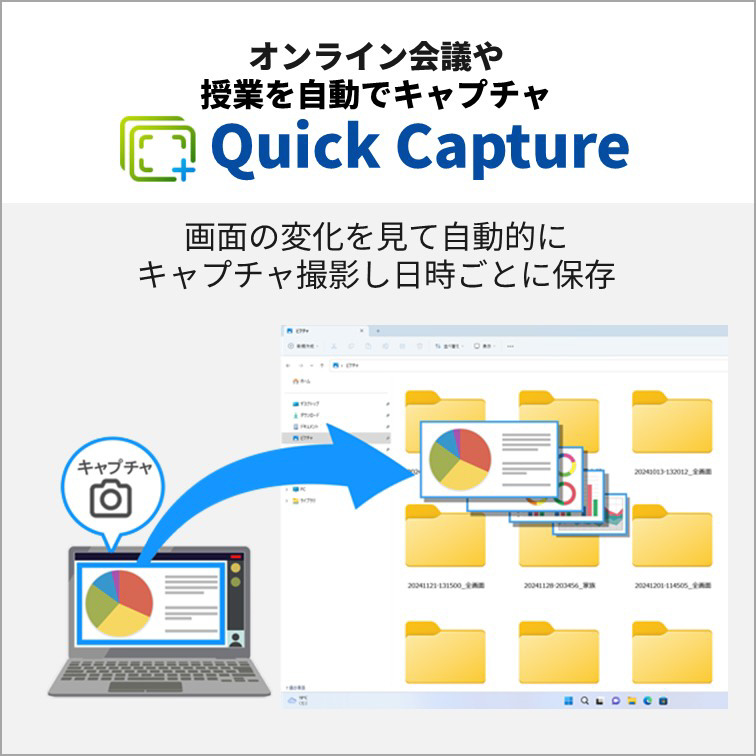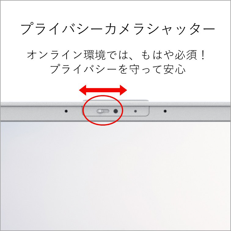 AIの力で自分の声も相手の声も自動で補正してくれる「AIノイズキャンセリング」と顔を補正してくれる「Umore」で、突然のオンライン会議にも余裕で対応。「Quick Capture」を使えば、AIを活用して画面のスクリーンショットを自動で保存してくれるので会議や授業に集中できます。カメラを使用しない時は物理的にシャッターを閉じることで、プライバシーを守ることができます。