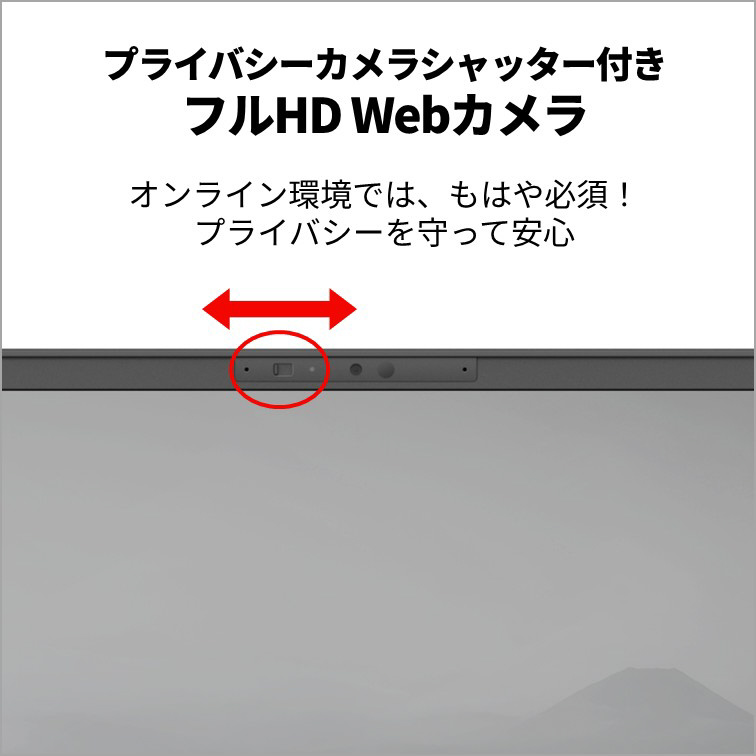 顔認証対応のフルHD Webカメラには物理的にカメラを隠せる、プライバシーカメラシャッターが付いているので、顔を出したくないときにも安心です。