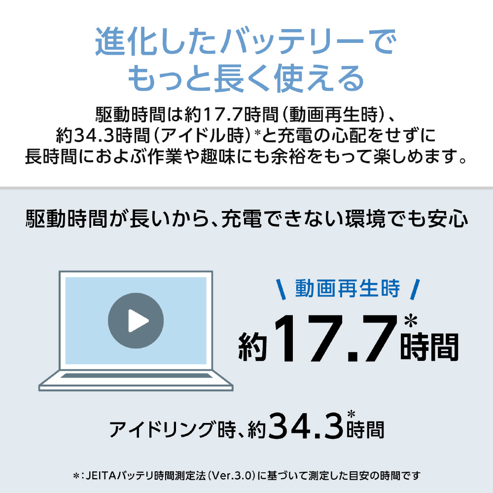 JEITA測定法 (Ver.3.0):動画再生時 約17.7時間、アイドル時 約34.3時間