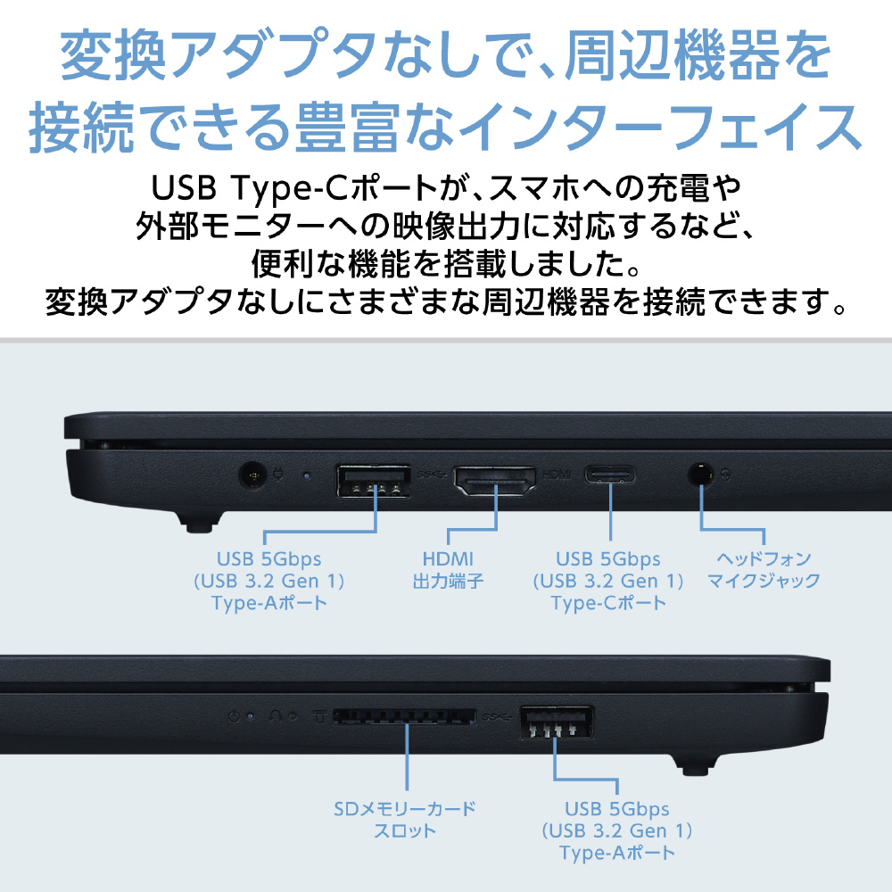 USB Type-Cポートが、スマホへの充電や外部モニターへの映像出力に対応するなど、便利な機能を搭載しました。変換アダプタなしにさまざまな周辺機器を接続できます。