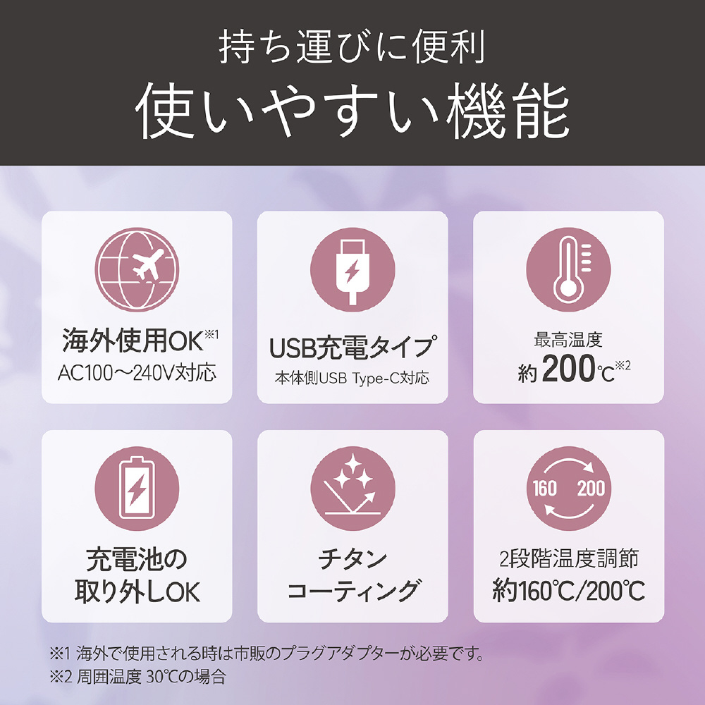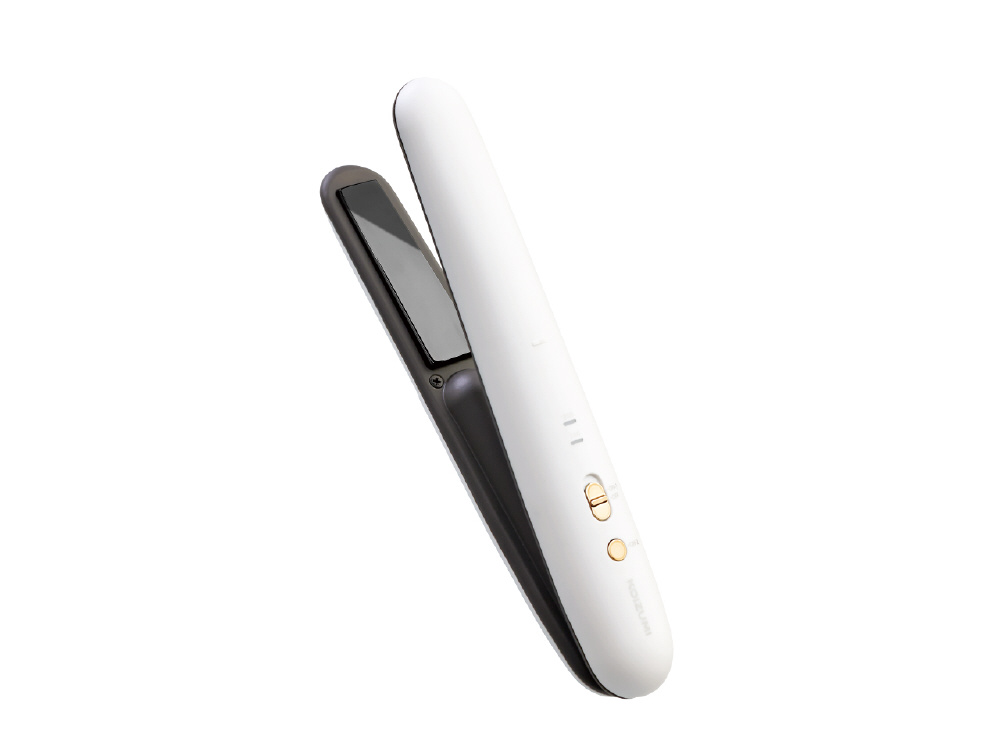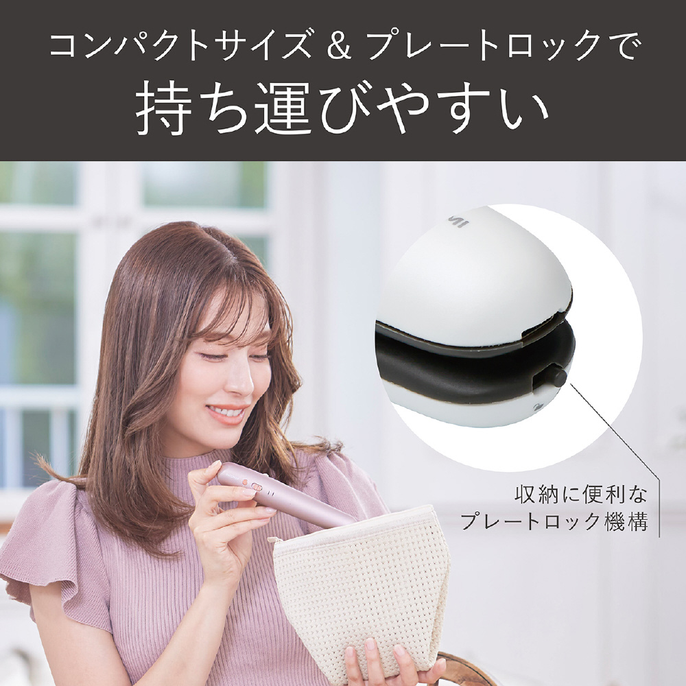 コードレスタイプのストレートアイロン。チタンコーティング採用 カールも作りやすいラウンドボディ、手のひらサイズ 海外使用OK、充電池取り外しOK、ポーチ付
