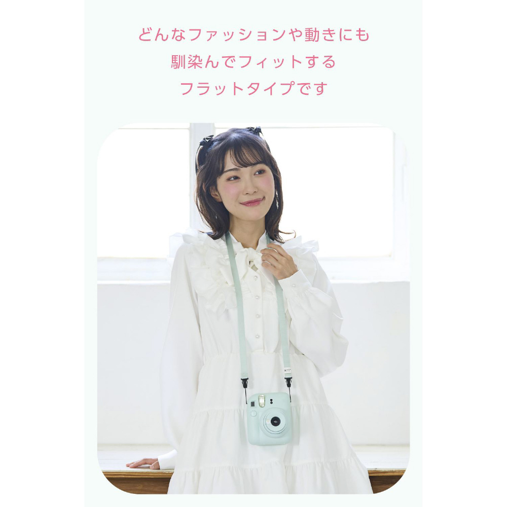 “instax”(チェキ)や“写ルンです”など、幅広いコンパクトタイプのカメラに使えるネックストラップです。首掛け、肩掛け、たすき掛けの3WAYタイプ。カメラを首や肩に掛けておけば、バッグから出さずにすぐ撮影できるので、撮りたい瞬間を逃しません。instax mini 12(チェキ)シリーズとのカラーコーディネートも楽しめ、カメラやカメラケースとお揃いにすればファッションのアクセントとしても活躍します。