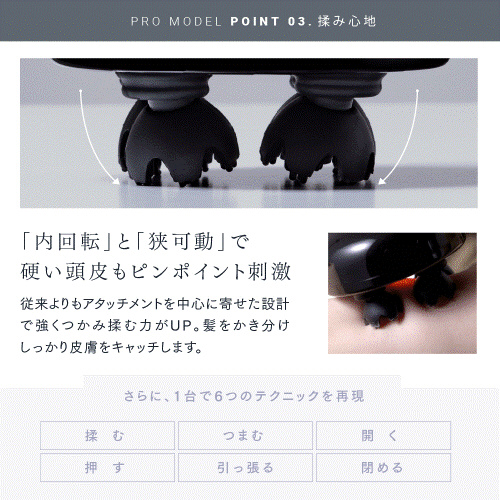 ■「内回転」と「狭可動」で硬い頭皮もピンポイントに刺激