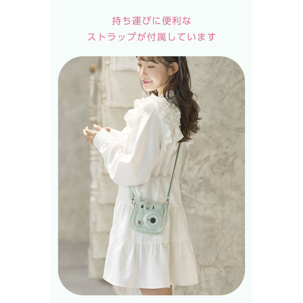 クリアタイプで、チェキ本体のカラーを活かしながら可愛く持ち運べます。エッジの部分はinstax mini 12(チェキ)シリーズ本体のカラーに合わせているので、本体とのコーディネートも楽しめます。
