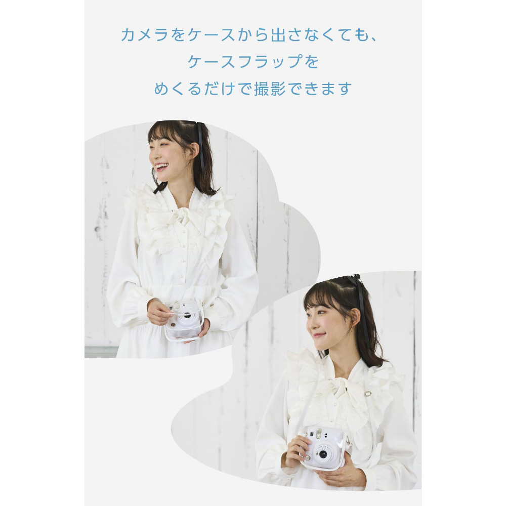 instax mini 12(チェキ)を傷やホコリから守るカメラケースです。ケースからカメラを取り出す手間なく、フラップをめくるだけですぐに撮影できるので、思い立った瞬間を逃しません。クリア素材で本体カラーを活かしたまま、チェキの可愛さを引き立てます。チェキの可愛さはそのままに、毎日の撮影をもっと楽しくします。