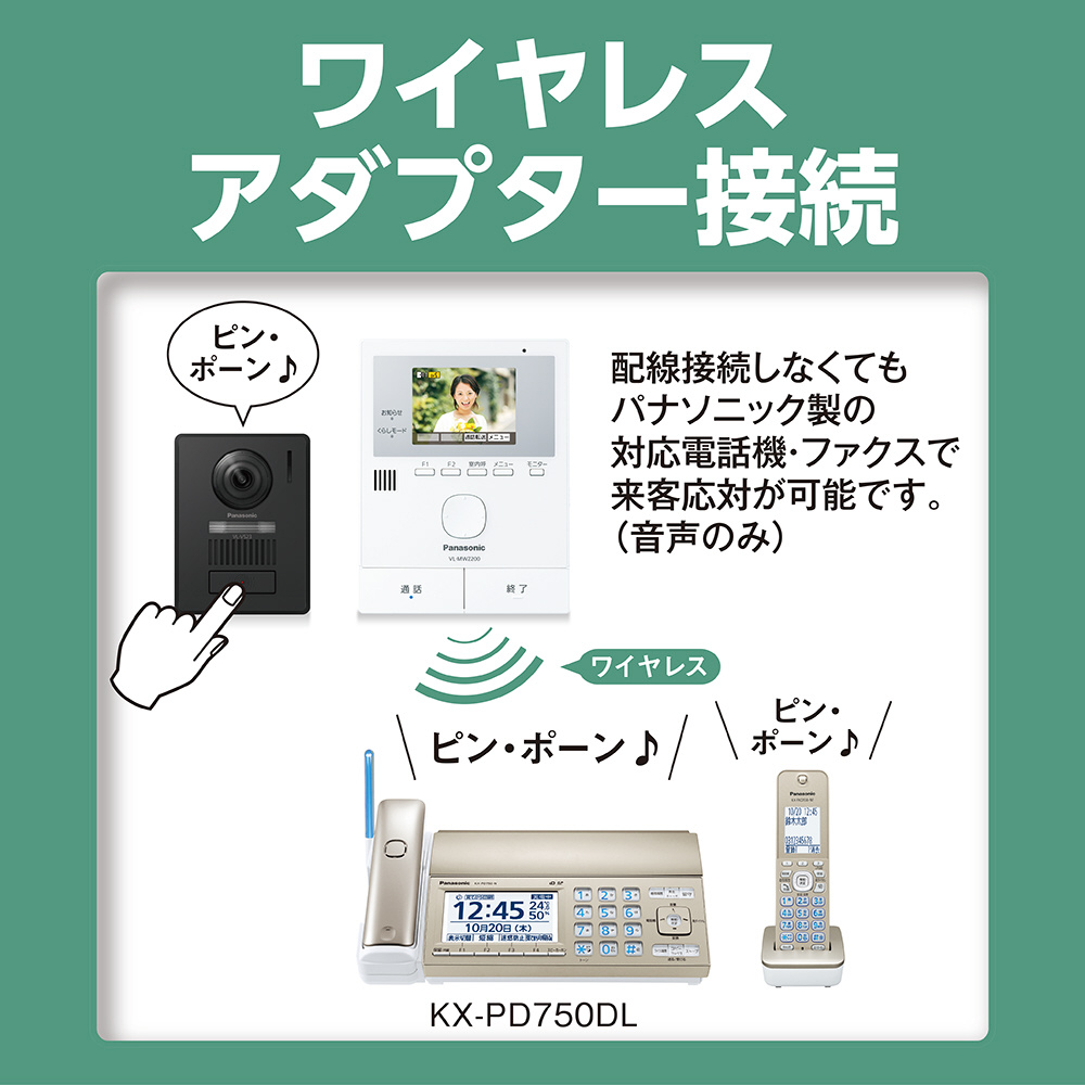 親機と?機の間の?倒な配線?事も不要でワイヤレスモニター?機は持ち運びができ、置き場所を選びません。