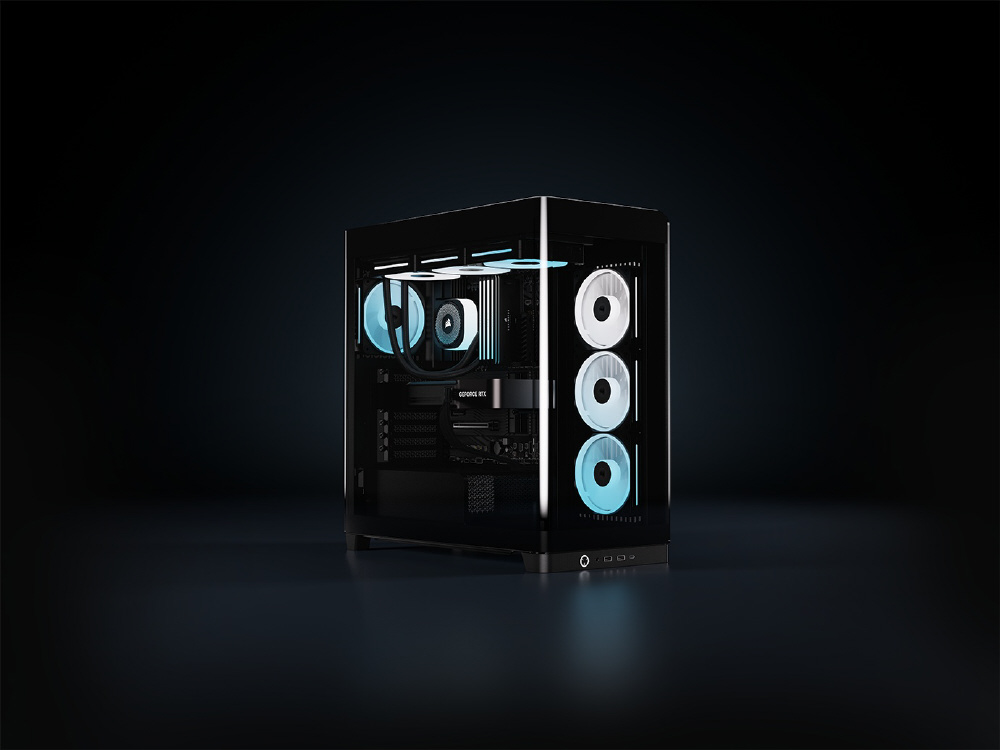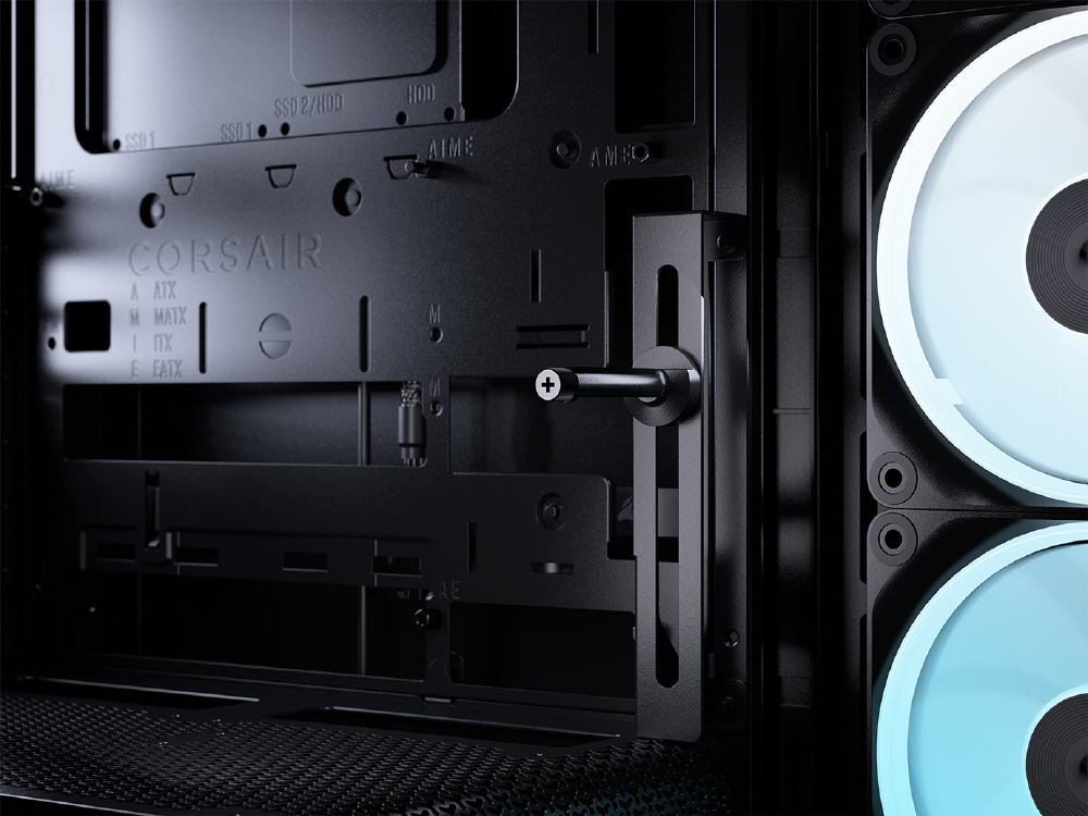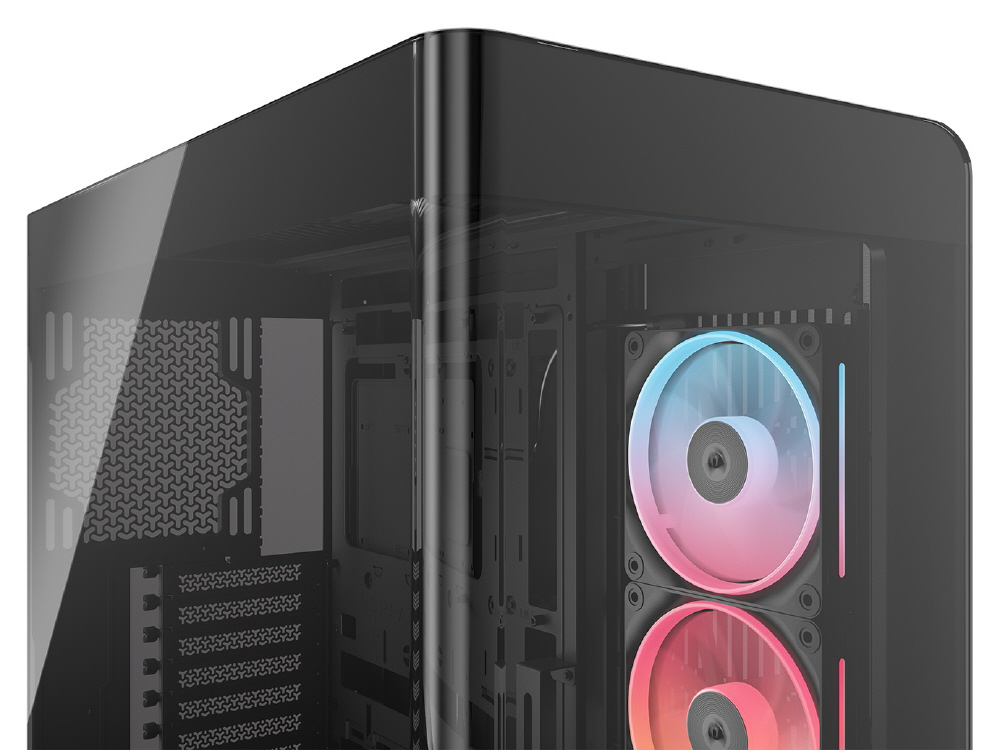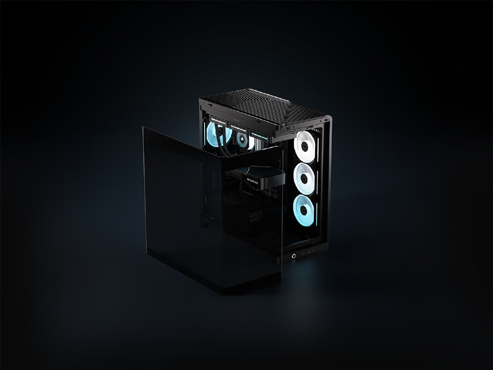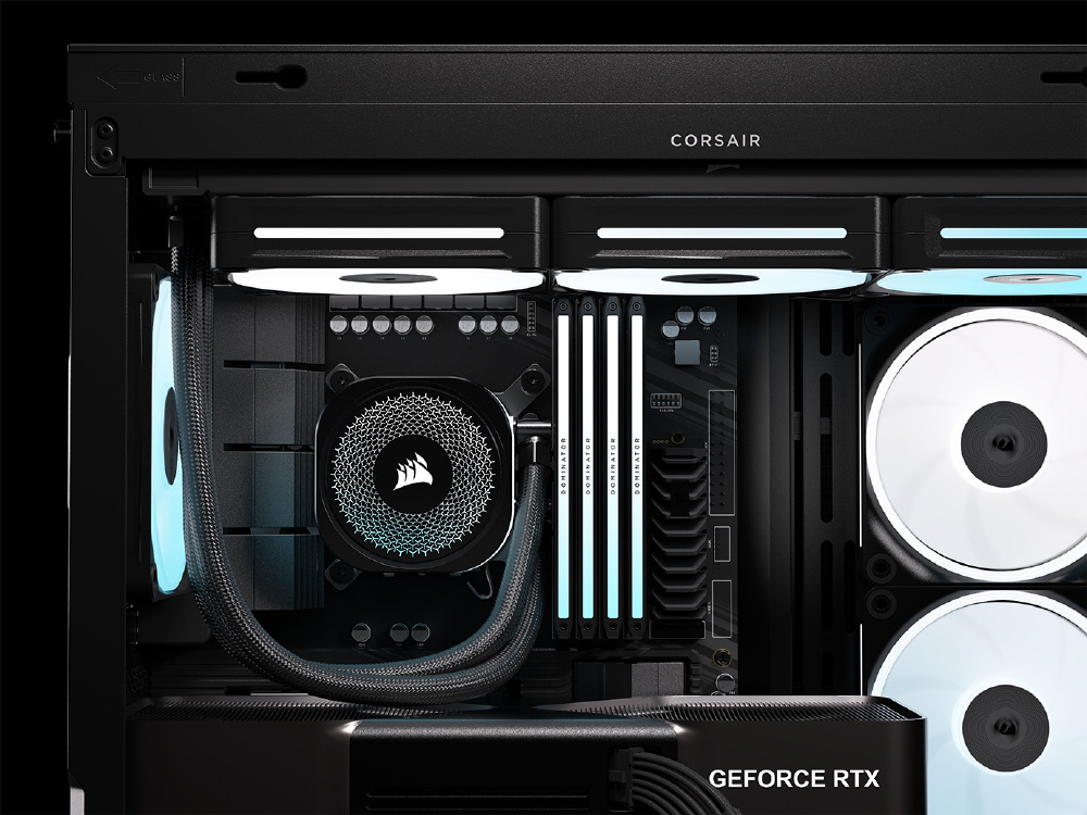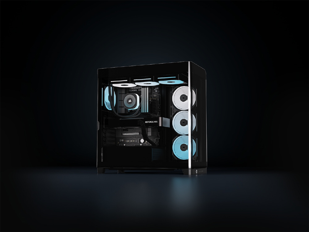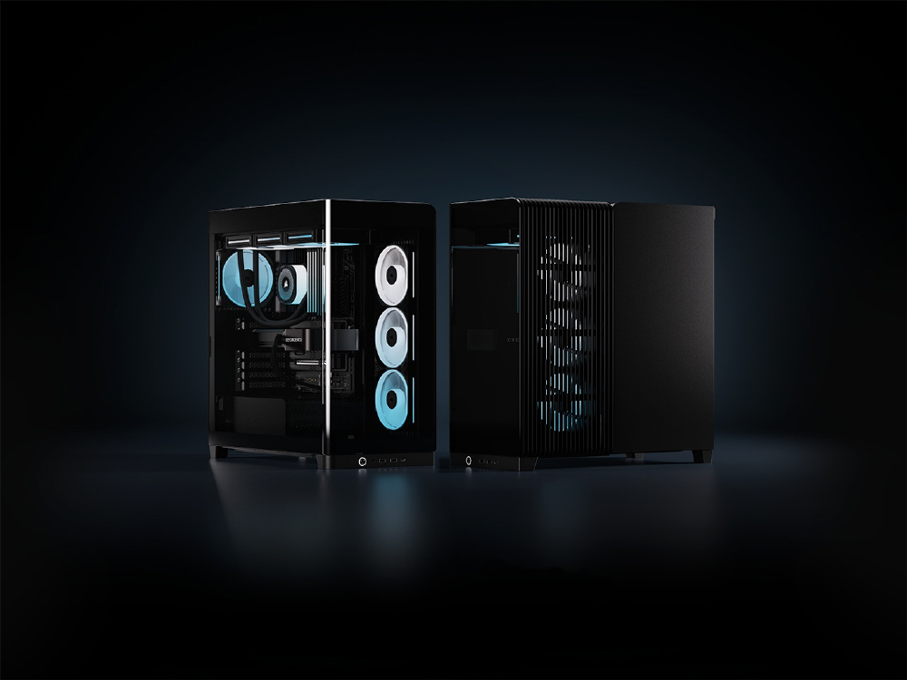 曲面強化ガラスパネルとInfiniRailシステムを採用。リバースローター設計のiCUE LINKファンを備えるミドルタワー型PCケース