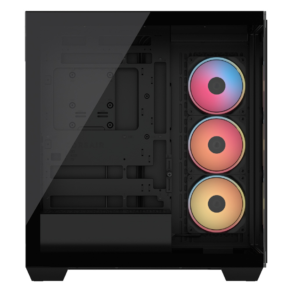 リバースローター設計のiCUE LINKファンを搭載。背面コネクタ設計のマザーボードに対応するピラーレスデザインのミドルタワー型PCケース