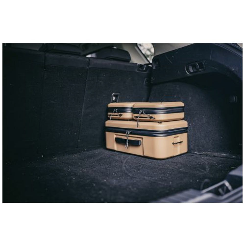 同シリーズのギアケースとスタッキングが可能です。MサイズはLサイズ約1/2の大きさで、同サイズ同士の重ね置きはもちろん、Lサイズの上にMサイズを2つ並べて配置できます。