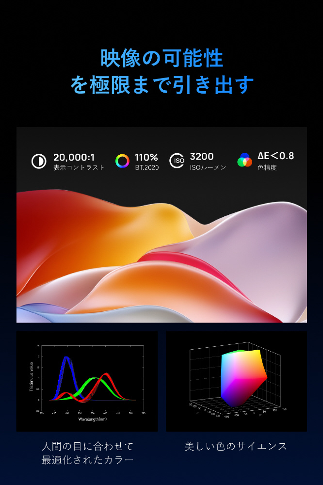 RGB3色レーザーエンジン「X-Master」を搭載し、次世代のビジュアル表現を実現。十分な明るさで日中の視聴にも対応できる一方、波長範囲を拡大することで、スペックルや色収差を抑え、より鮮明で純度の高い映像を映し